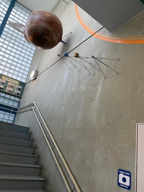 ここで特筆すべきは、展示の「解像度」である。壁面に配置された惑星のモデルは、単なる模型の域を超え、その空間自体を一つの小宇宙へと変容させている。コンクリート打ち放しのモダンな内装が、惑星の鮮やかな色彩をより一層際立たせている。