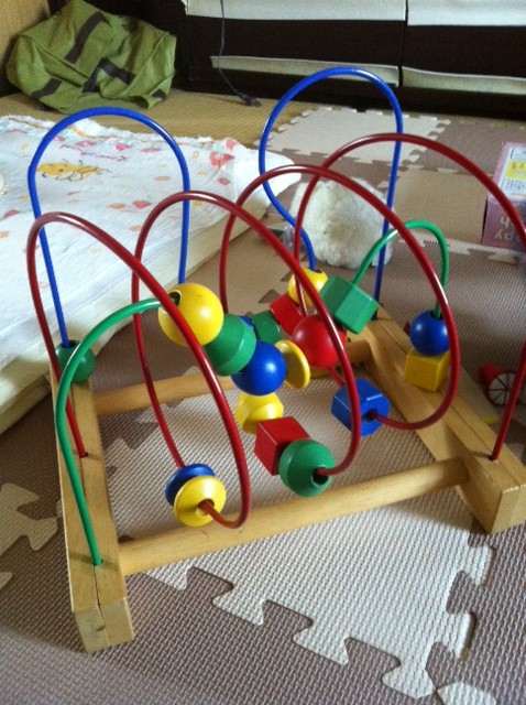 我が家には運良く、イケアのルーピングとかビーズコースターとかいうのでしょうかね、ラベルには「800 140 41 IKEA」としか書いてないので正確な名前知りませんが、そういうカラフルなおもちゃがあります。
